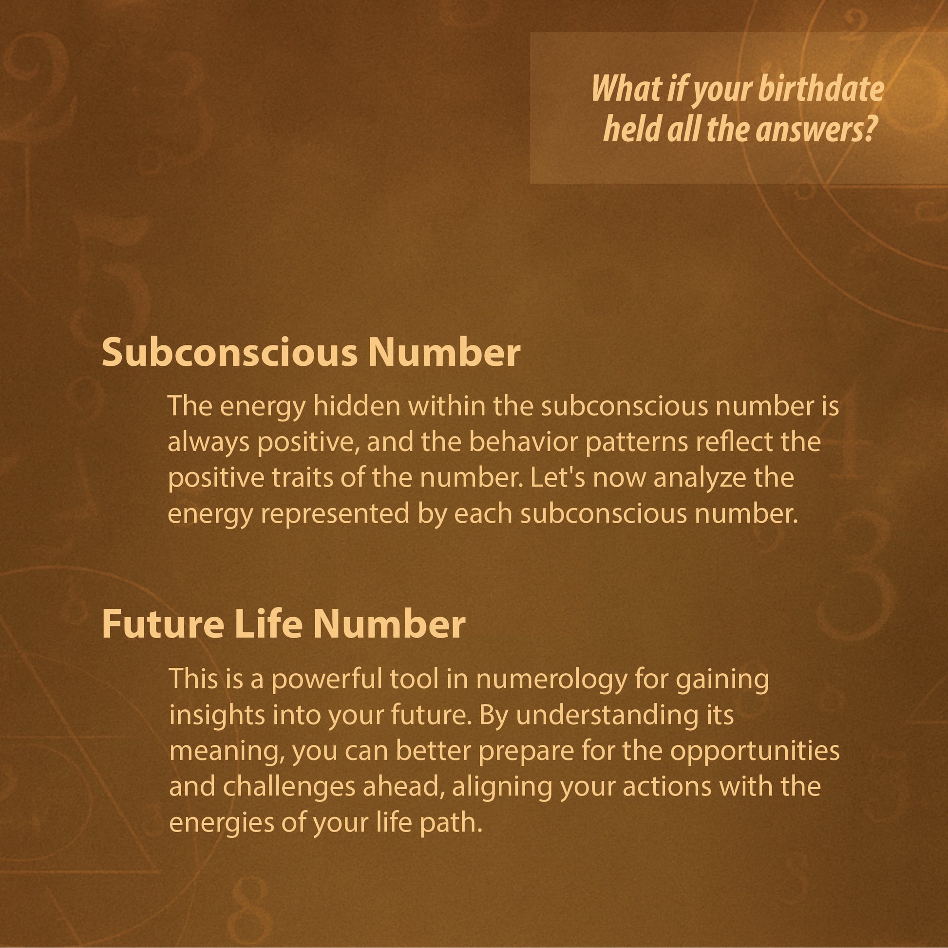 ✔️ Subconscious Number - Tap into the hidden powers within. This number represents the positive energies shaping your instincts, internal motivations, and quiet strengths.