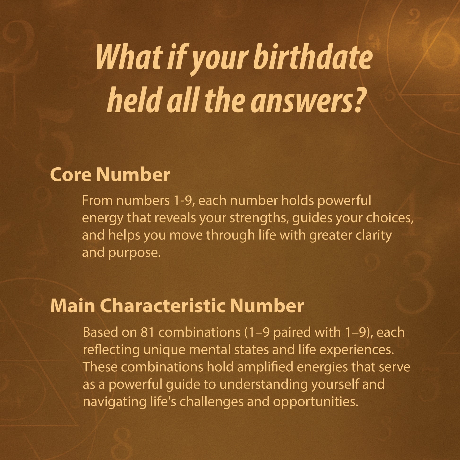 ✔️ Core Number - Your foundational life force. Discover how your number (1–9) reveals your natural strengths, blind spots, and the best way for you to move forward in life.