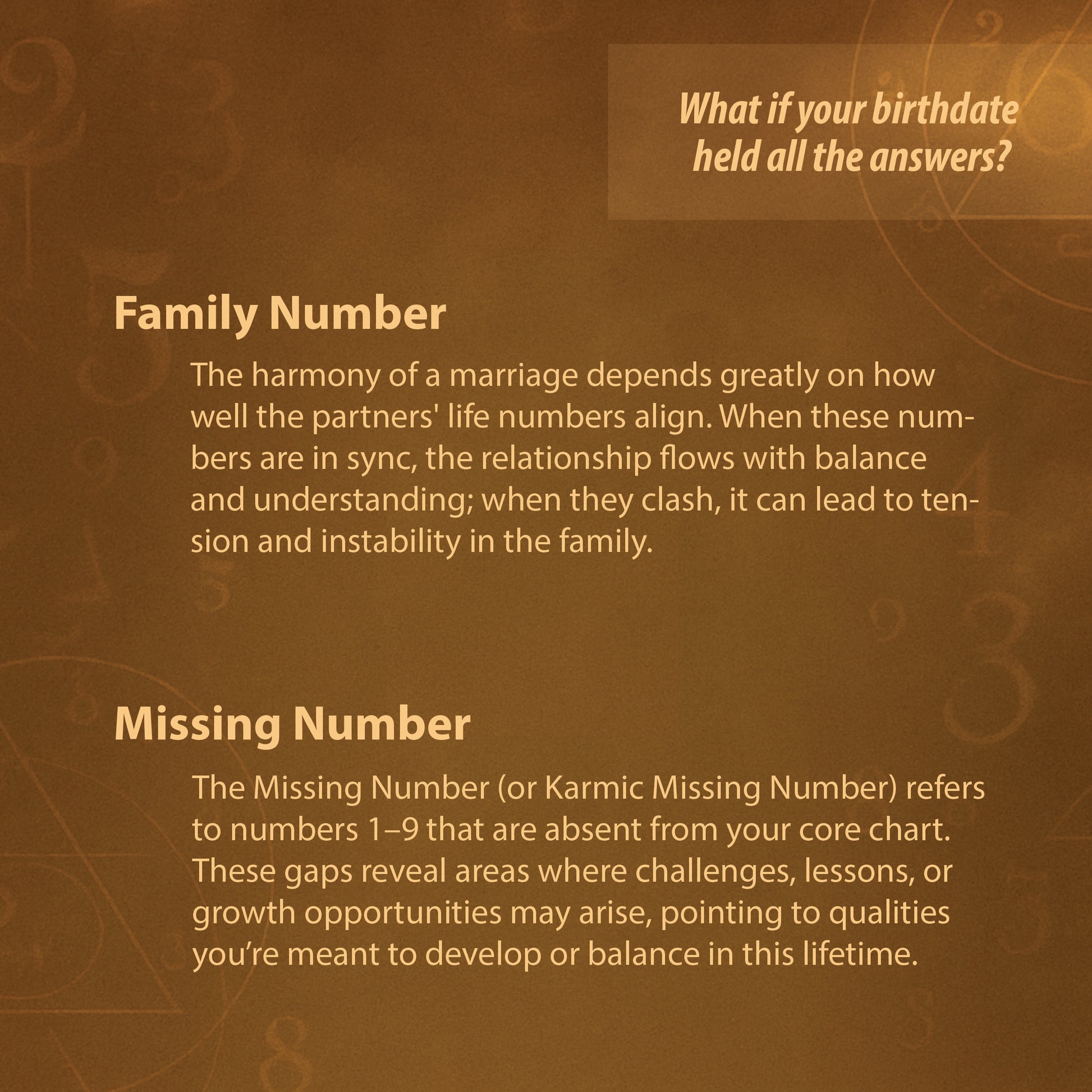 ✔️ Missing Numbers – Discover what lessons your soul came here to learn and the areas needing growth or healing